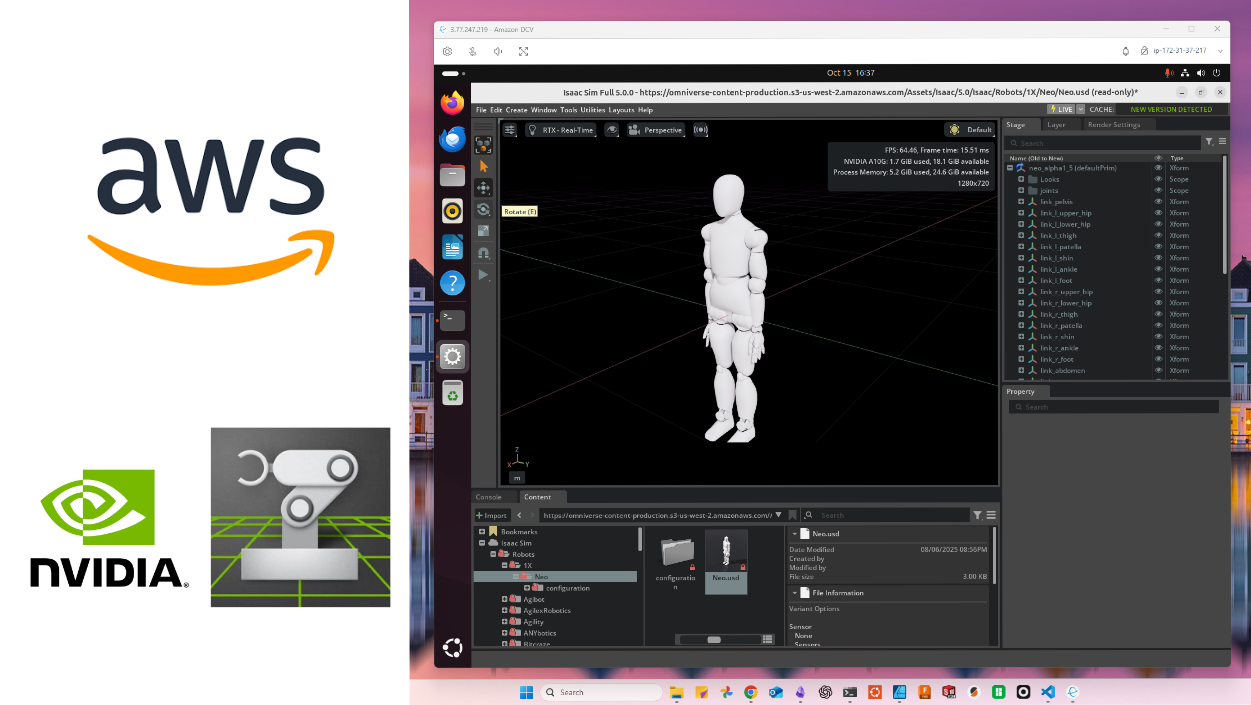 The tricky part I had to figure out was setting up the remote desktop with Amazon DCV- installing Isaac Sim (& Isaac Lab) was pretty straightforward, as I started out from the NVIDIA GPU-optimzied AMI which has the NVIDIA drivers already installed.